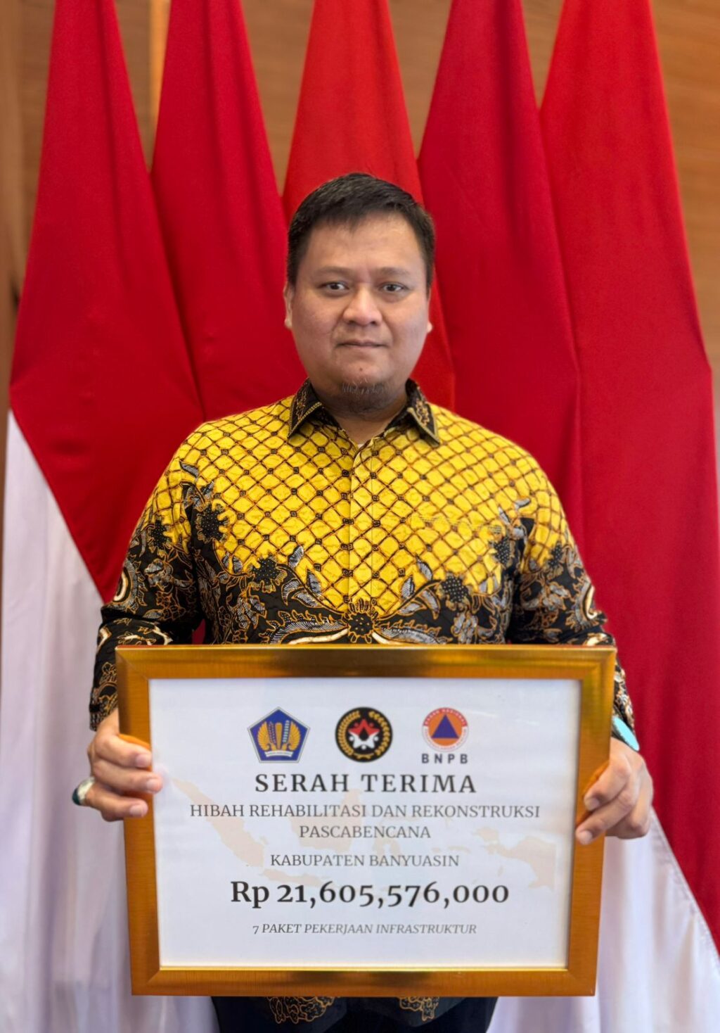 Jakarta — Pemerintah Kabupaten Banyuasin menerima Hibah Rehabilitasi dan Rekontruksi Pasca Bencana Pusat sebesar Rp. 21,6 Milyar dari Badan Penanggulangan Bencana Nasional (BNPB) Pusat. Penyerahan dana hibah ini diberikan secara simbolis oleh Menteri Koordinator Bidang Pembangunan Manusia dan Kebudayaan, Prof. Dr. Pratikno, M.Soc.Sc., bersama Kepala BNPB Letjen TNI Dr. Suharyanto S.Sos M.M kepada Sekretaris Daerah Banyuasin selaku kepala bppd ex officio kabupaten banyuasin Ir. Erwin Ibrahim, ST., MTM., MBA., IPU., ASEAN