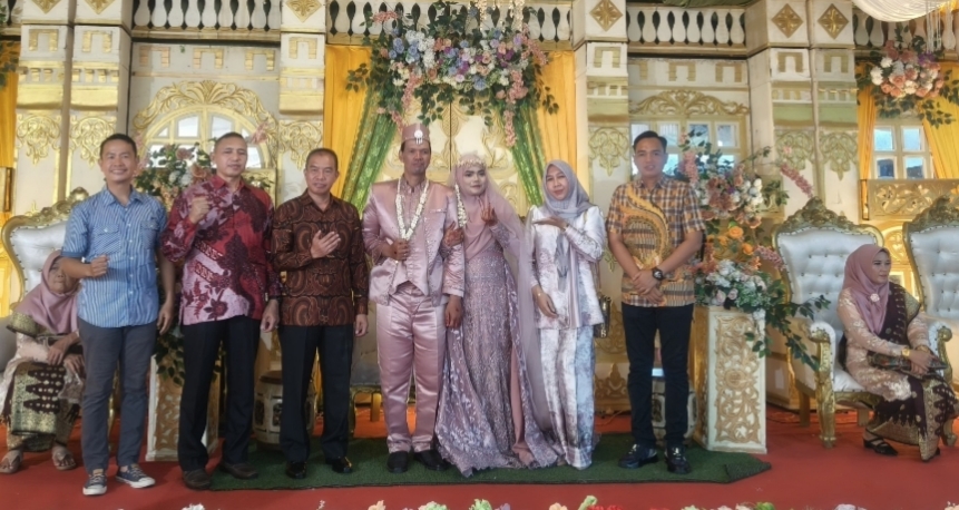 Momen resepsi sang putra dengan pujaan hati berparas cantik tersebut nampak begitu meriah nan mewah. Sang putra yang diketahui merupakan anggota Polri yang sehari harinya bertugas distaf Subbid Penmas Bidhumas Polda Sumsel itu pun turut tampil gagah.