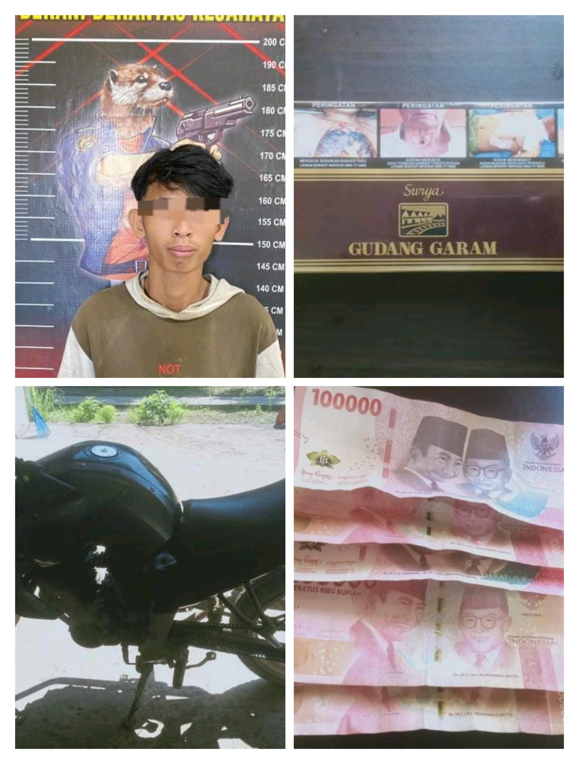 Pelaku FI saat diringkus juga turut diamankan barang bukti berupa Uang tunai. Rp.392.000, 00, 1 buah buket bunga, dan 1 unit sepeda motor Yamaha Vega warna Hitam,