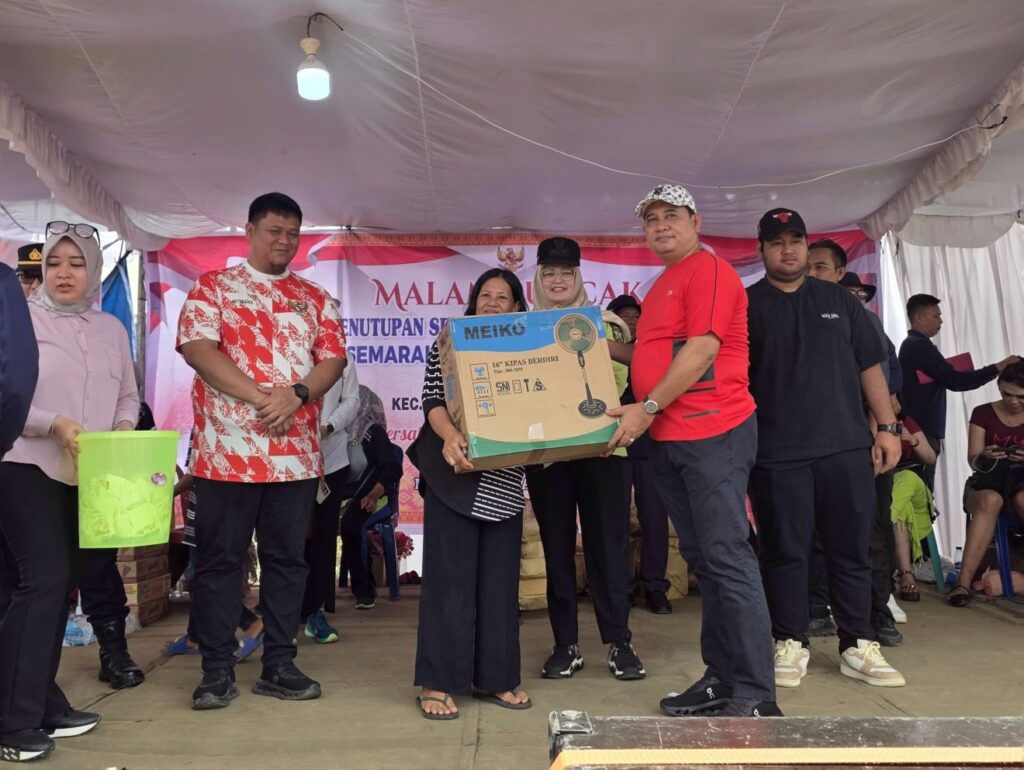 Acara puncak semarak HUT RI di Merah Mata diakhiri dengan penyerahan secara simbolis bantuan Peralatan dan Bahan Tenun Songket Kepada IKM Kampung Songket Desa Merah Mata Dari Dekranasda Banyuasin dan Diskoperindag Banyuasin serta pembagian hadiah bagi peserta jalan santai dan karnaval.(ind/amr*)