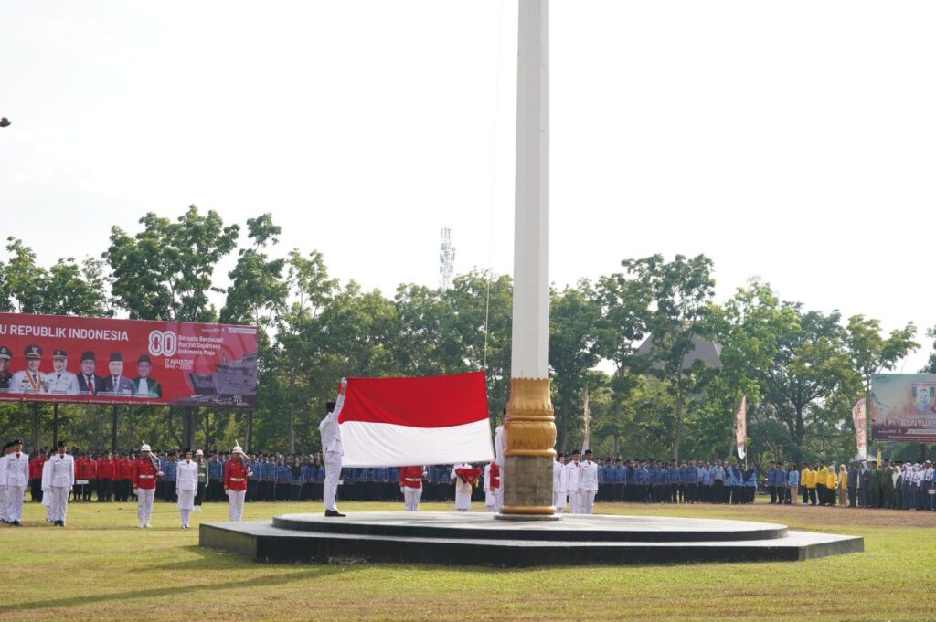 PANGKALAN BALAI — Upacara bendera Hari Ulang Tahun (HUT) ke-80 Kemerdekaan Republik Indonesia di Halaman Kantor Bupati Banyuasin, Minggu pagi (17/8/2025), berlangsung khidmat.