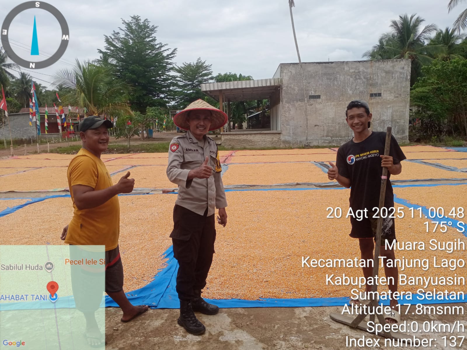 *BANYUASIN – Ps.Kanit Binmas Polsek Tanjung Lago Aiptu Amran Firdaus melakukan pengecekan penjemuran hasil panen jagung dan sosialisasi harga jagung di Desa Banyu Urip, Kecamatan Tanjung Lago, Rabu (20/8).*