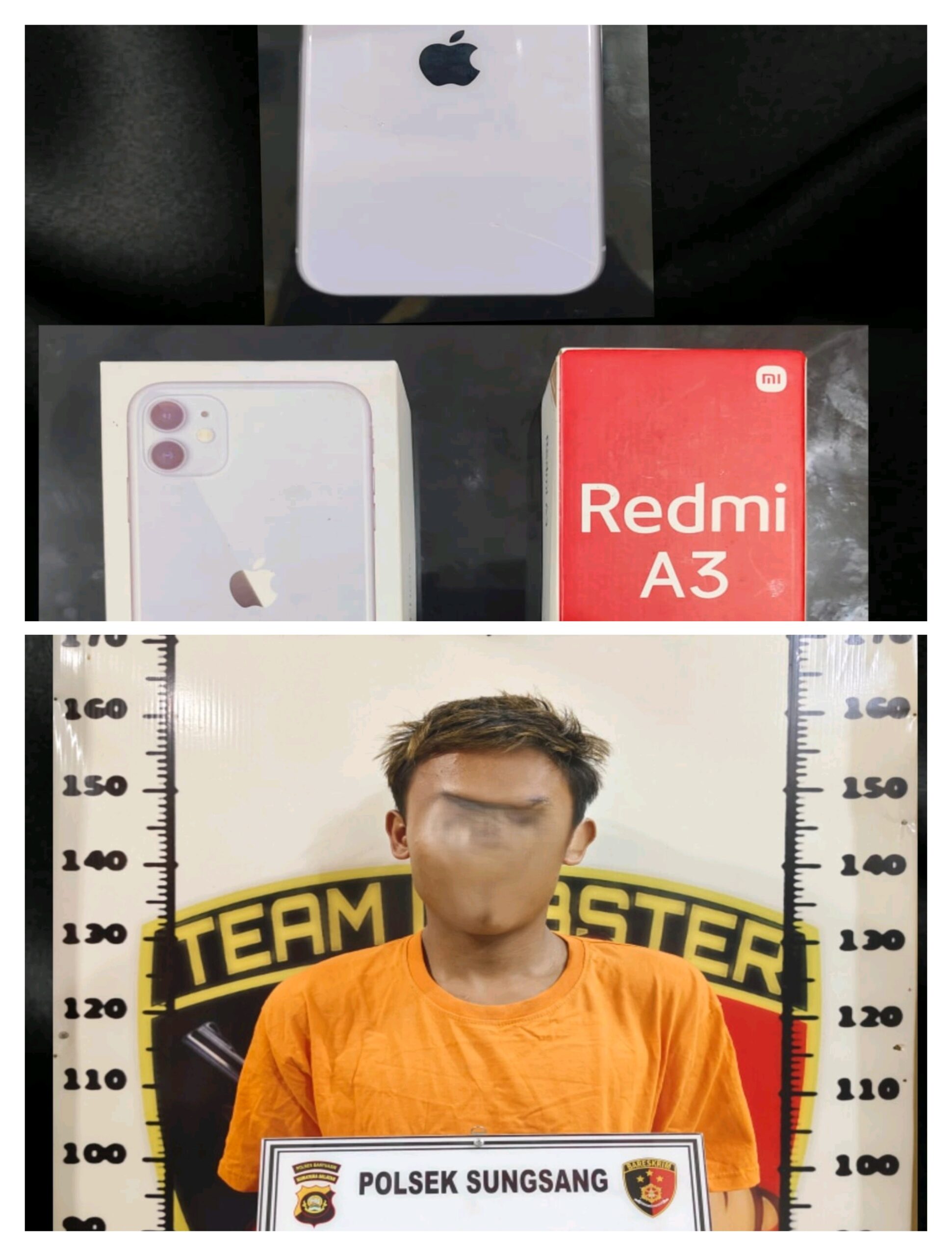 Dari tangan tersangka, polisi berhasil mengamankan satu unit handphone iPhone 11 warna ungu beserta kotaknya, dan satu buah kotak handphone Redmi A3. Dua unit handphone lainnya diduga telah dilepas oleh tersangka.