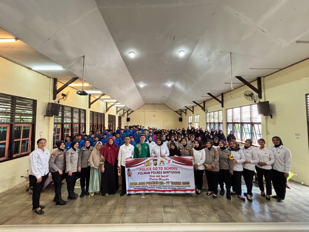 *Banyuasin* – Sebanyak 30 personel Polisi Wanita (Polwan) dari Polres Banyuasin melaksanakan kegiatan Polwan Goes to School dalam rangka memperingati Hari Jadi Polwan ke-77. Kegiatan yang berlangsung di Yayasan Pendidikan dan Dakwah AKUIS Kecamatan Talang Kelapa pada Senin (8/9/2025) ini diisi dengan sosialisasi pentingnya tertib berlalu lintas, bahaya narkoba, dan pencegahan kenakalan remaja.