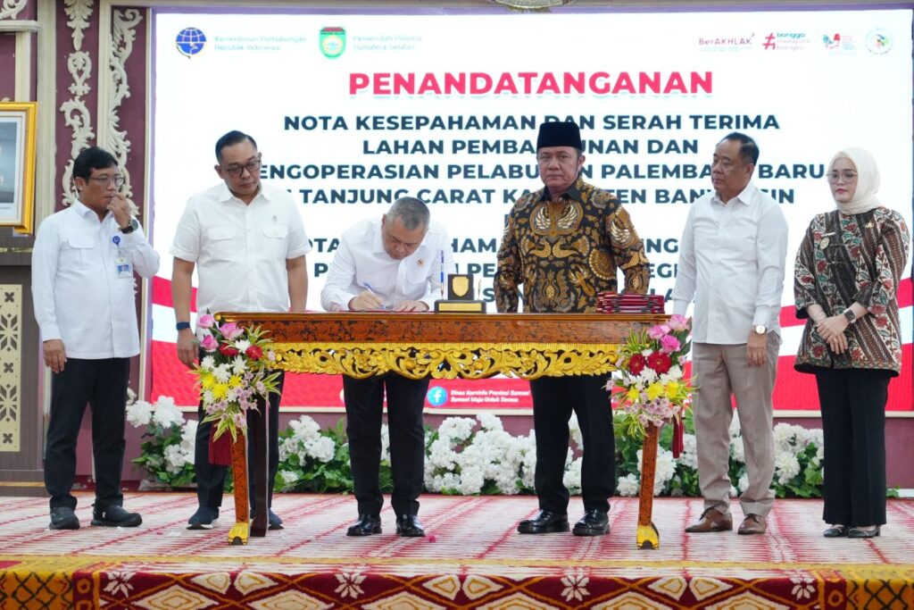 Palembang – Wakil Bupati Banyuasin, Netta Indian, S.P., mewakili Bupati Banyuasin menghadiri Penandatanganan Nota Kesepahaman dan Serah Terima Lahan Pembangunan dan Pengoperasian Pelabuhan Palembang Baru Di Tanjung Carat Kabupaten Banyuasin dan Nota Kesepahaman Penyelenggaraan Pelabuhan Pengumpan Regional Di Provinsi Sumatera Selatan, Jum’at (31/10/2025).