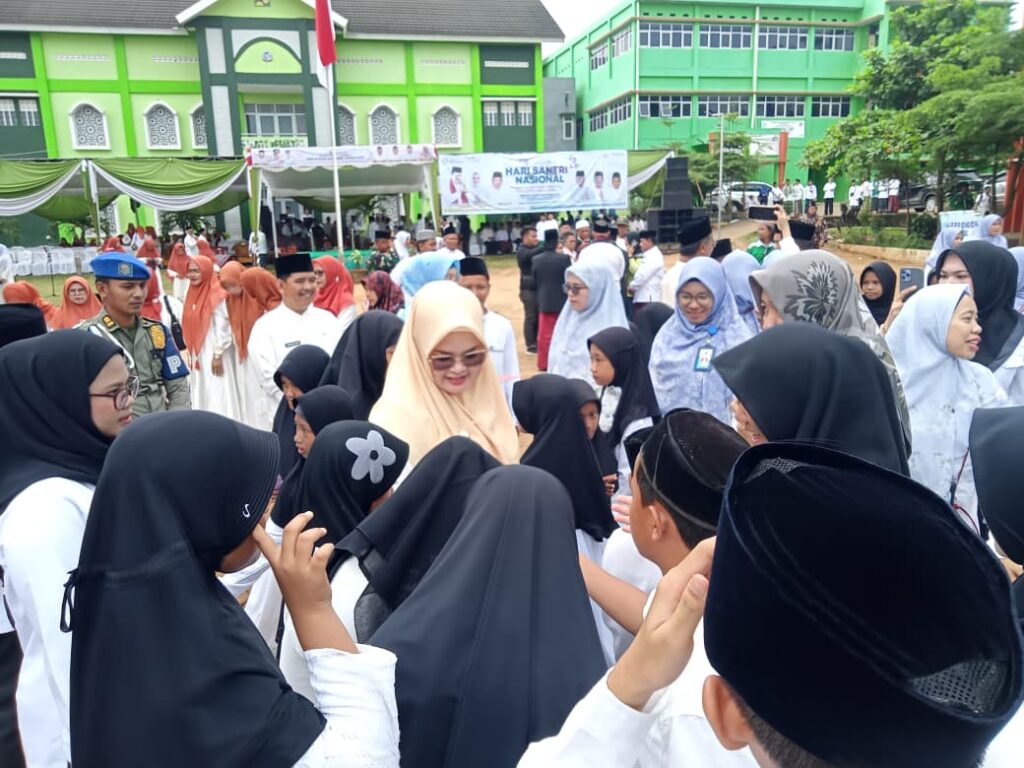Talang Kelapa — Dalam rangka memperingati Hari Santri Nasional Kabupaten Banyuasin, Wakil Bupati Banyuasin, Netta Indian, SP menghadiri dan menjadi Pembina Upacara Hari Santri Nasional digelar di Ponpes Nurul Ilmi Kelurahan Sukamoro, Kecamatan Talang Kelapa, Kabupaten Banyuasin.