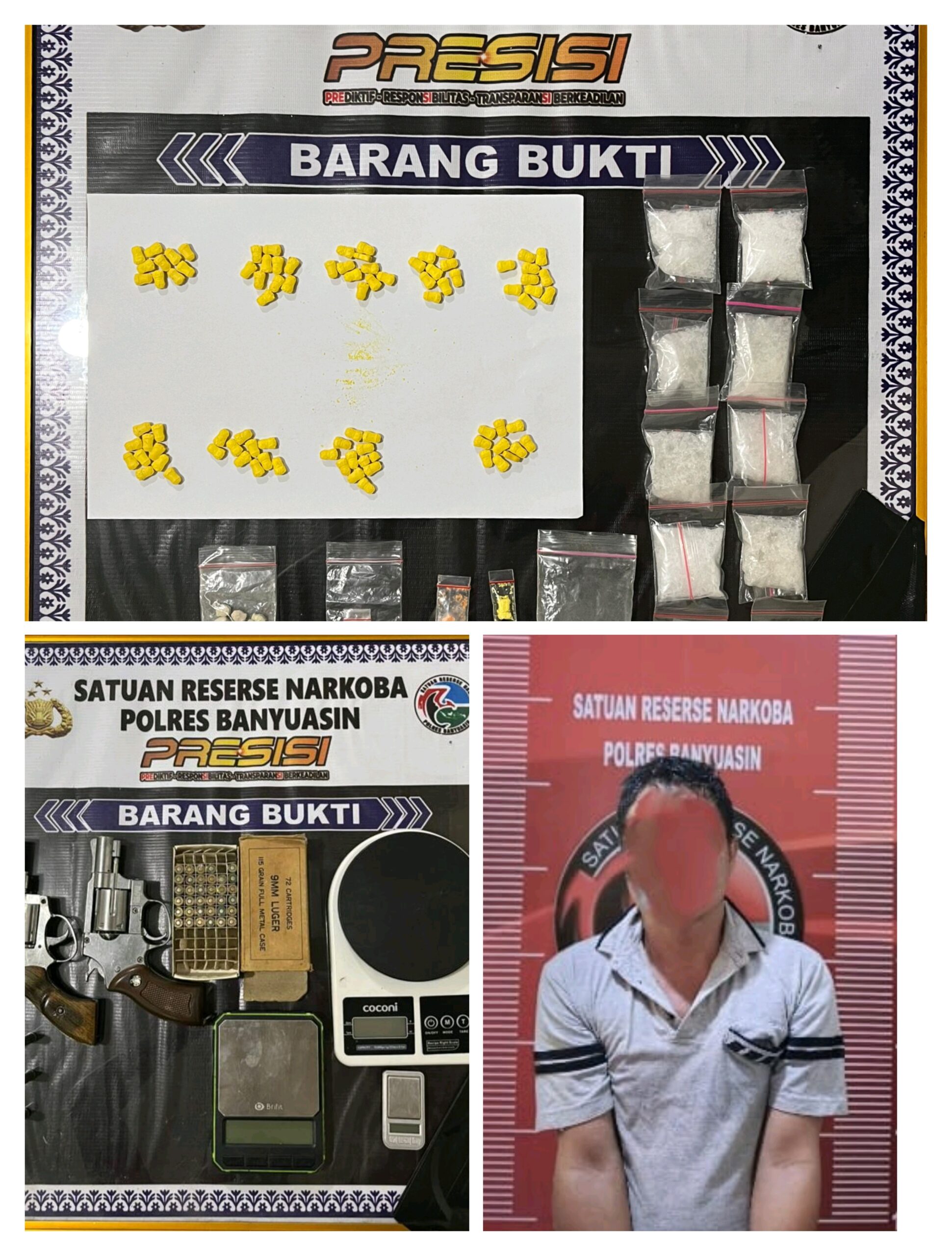 Banyuasin – Satuan Reserse Narkoba (Satresnarkoba) Polres Banyuasin meringkus seorang bandar sekaligus pengedar narkotika jaringan lokal di Desa Tanjung III, Kecamatan Rantau Bayur, Kamis (20/11/2025) pagi. Pelaku berinisial C.A.U.B. (47) ditangkap beserta barang bukti puluhan gram sabu-sabu, ekstasi, hingga senjata api rakitan.