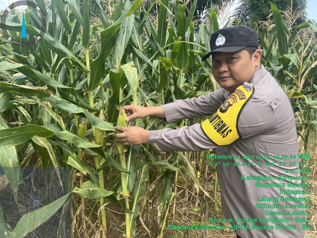 Banyuasin – Dalam rangka mendukung program ketahanan pangan nasional, Bhabinkamtibmas Polsek Pangkalan Balai melaksanakan kegiatan pengecekan dan perawatan tanaman jagung yang diproyeksikan sebagai sumber pangan berkelanjutan.