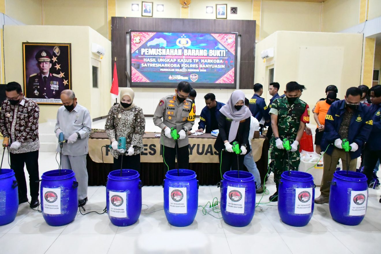 Wakil Bupati Banyuasin Netta Indian, SP didampingi Kapolres Banyuasin AKBP Risnan Aldino, S.I.K,.M.S,i. Dan Tim Penyidik Tindak Pidana Narkoba Satresnarkoba Polres Banyuasin memusnahkan barang bukti narkotika jenis sabu seberat 21.956,86 (dua puluh satu ribu sembilan ratus lima puluh enam koma delapan enam) gram atau hampir mencapai 22 kilogram. Pemusnahan dilaksanakan di Aula Sanika Satyawada Mapolres Banyuasin, Jum’at (13/2/2026). Barang bukti bernilai fantastis, diperkirakan mencapai Rp16 miliar, itu merupakan hasil pengungkapan sejumlah kasus peredaran narkoba di wilayah hukum Banyuasin.