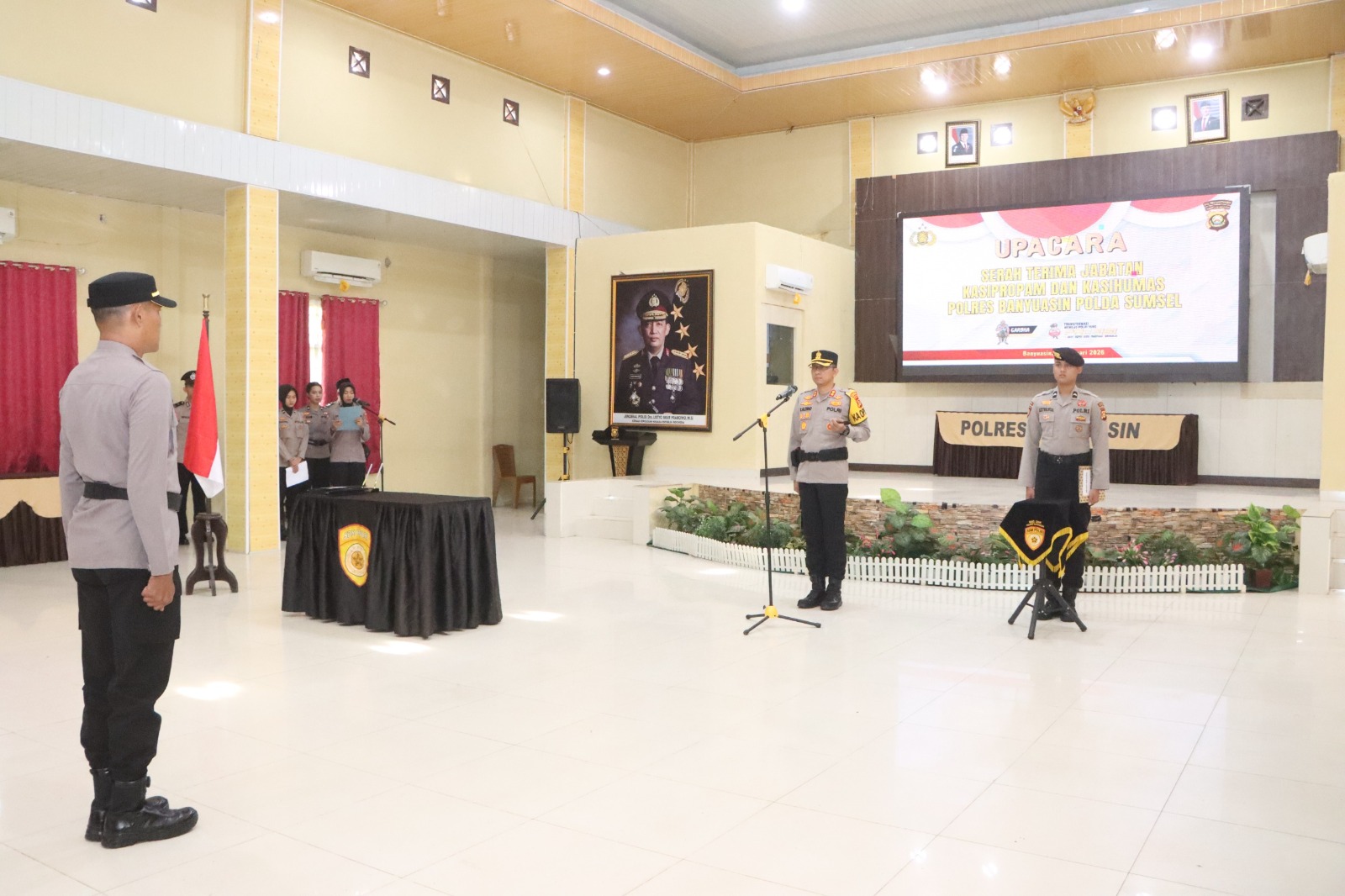 Rangkaian hari itu dimulai dengan Upacara Serah Terima Jabatan (Sertijab) di Aula Sanika Satyawada pada pukul 08.30 WIB. Upacara ini menandai pergeseran posisi penting di tubuh Polres Banyuasin. Kompol Farid Hasyim, yang akan memasuki masa pensiun, menyerahkan jabatan Kasipropam kepada AKP Tri Deswiyadi, S.H., yang sebelumnya menjabat Kasubbagkerma Bagops. Sementara itu, Iptu Abu Bakar, S.H. secara resmi dilantik sebagai Kasihumas baru, menggantikan posisi sebelumnya sebagai Kasubsipenmas Sihumas. Upacara ini dihadiri oleh seluruh pimpinan, perwira, staf, serta perwakilan Bhayangkari Cabang Banyuasin.
