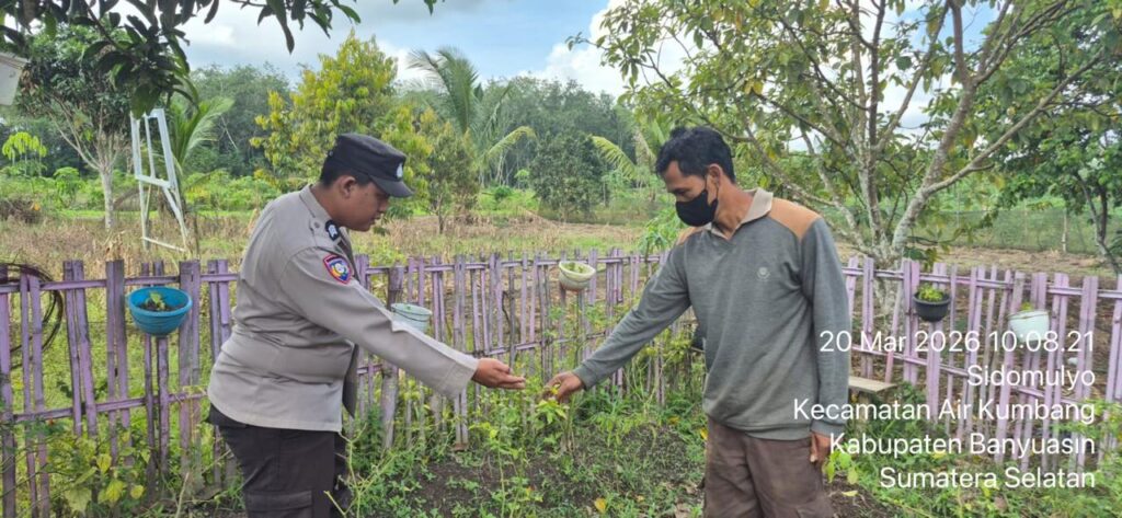 Kegiatan yang berlangsung pada Jumat (20/3/2026) pukul 13.00 WIB hingga selesai ini bertempat di Desa Sidomulyo, Kecamatan Air Kumbang, Kabupaten Banyuasin. Dalam kesempatan tersebut, Brigpol Iman Darmawan menyampaikan pentingnya peran aktif masyarakat dalam memanfaatkan lahan dan potensi lokal untuk meningkatkan hasil pangan, peternakan, serta perikanan.